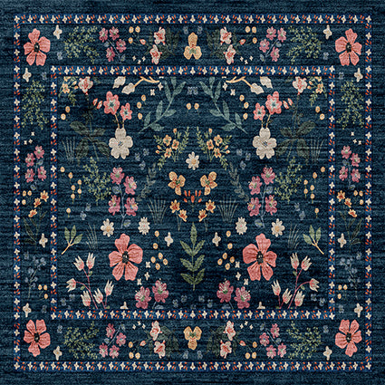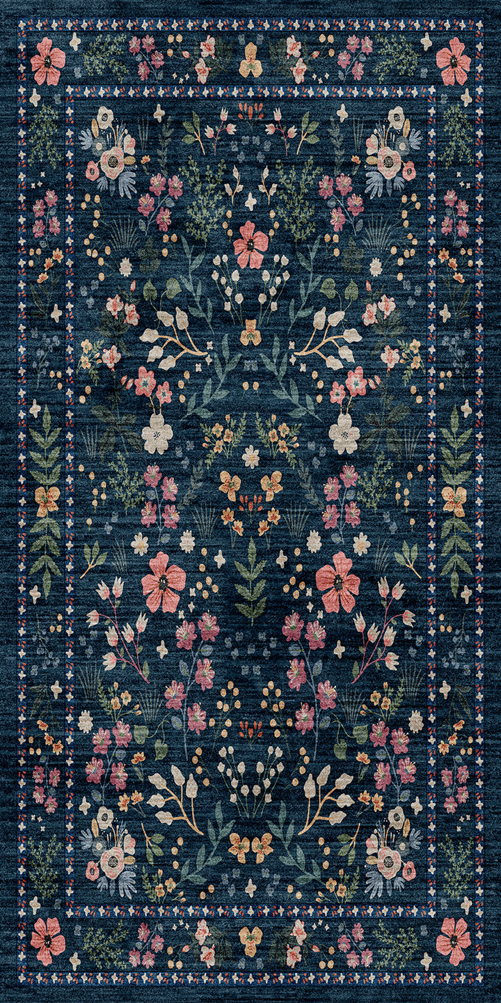 Floral patterned rug with pink, yellow, and green flowers on a dark blue background